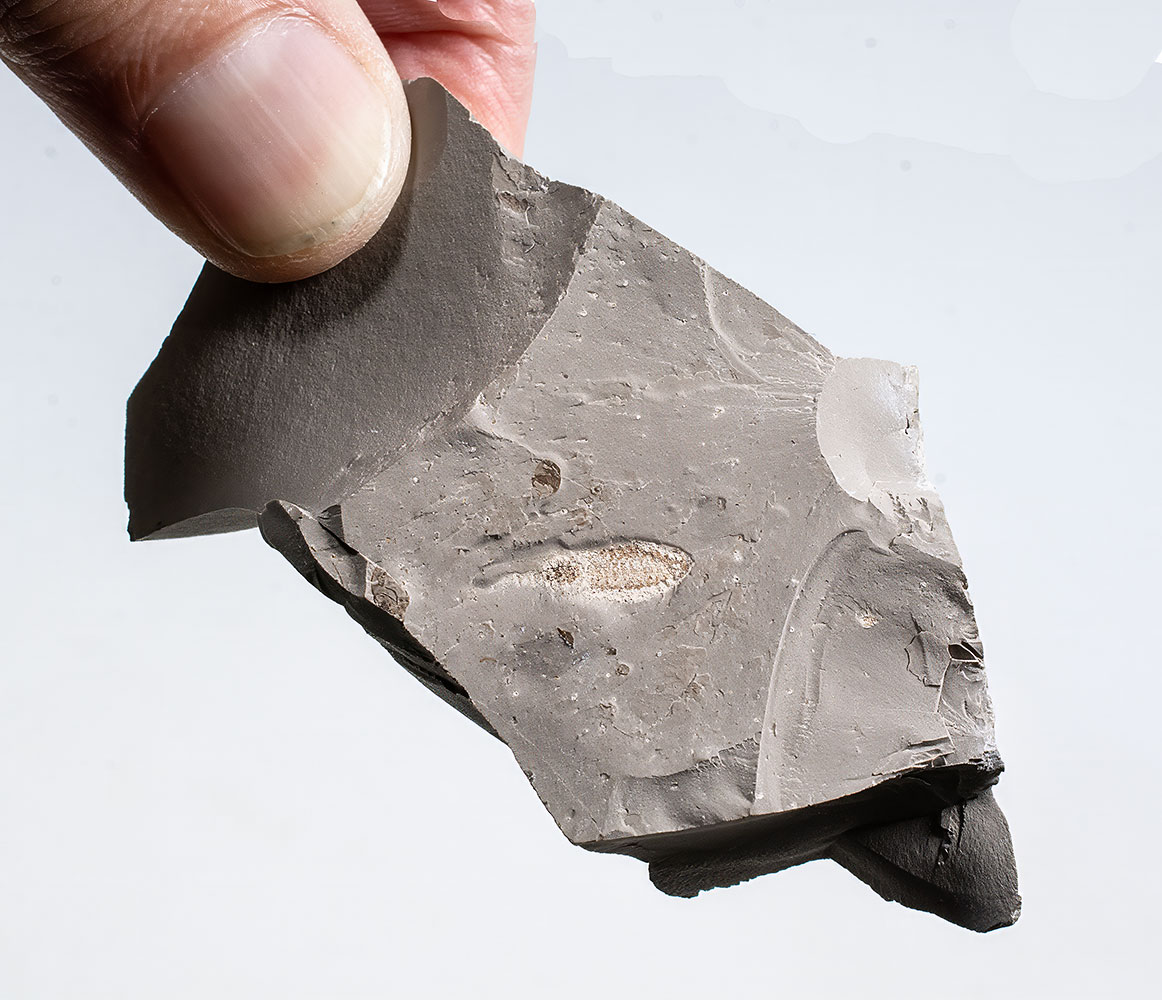 14mm on 72mm slab. One of the only known anostracans (fairy shrimp) from the mesozoic.