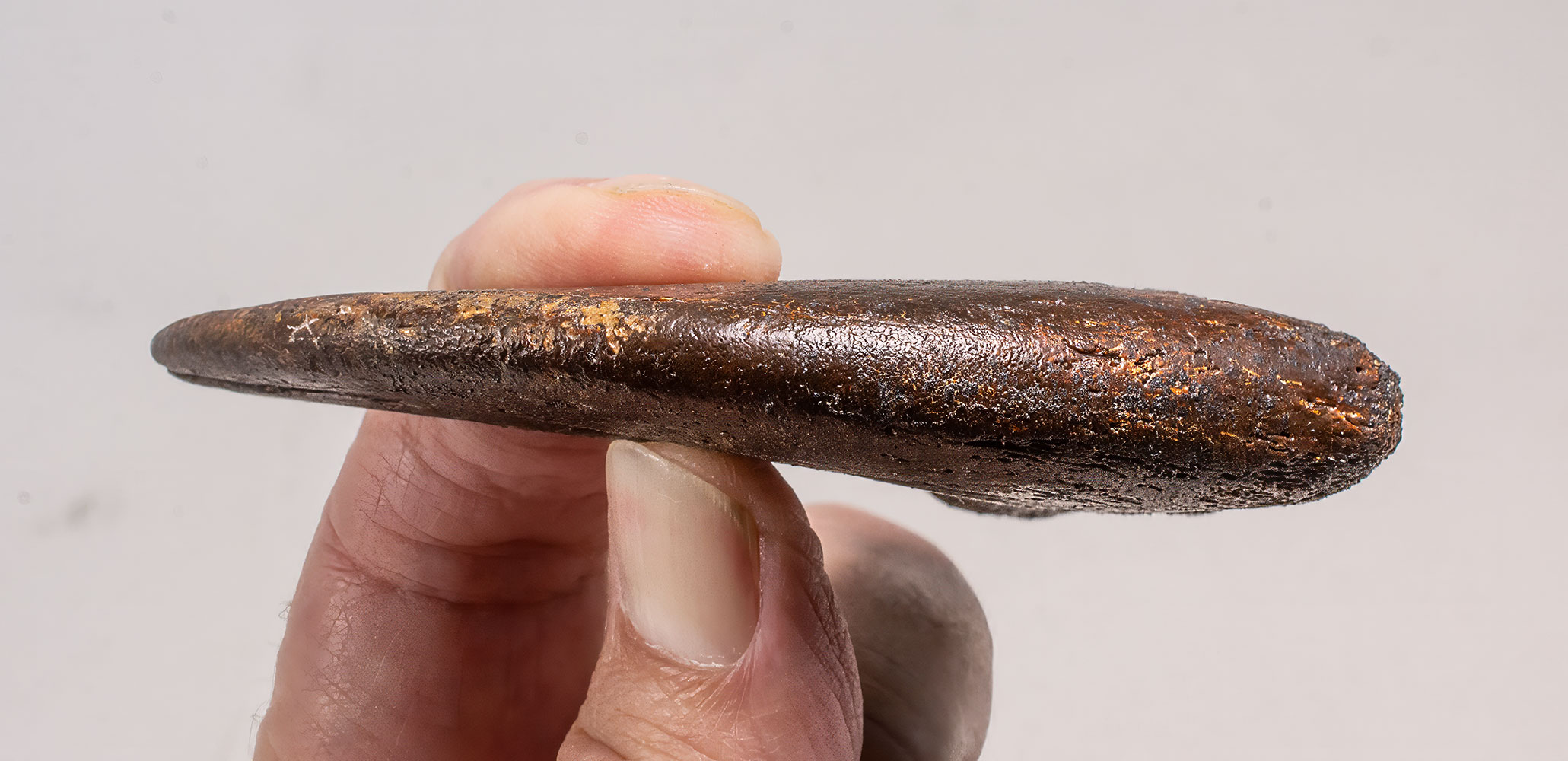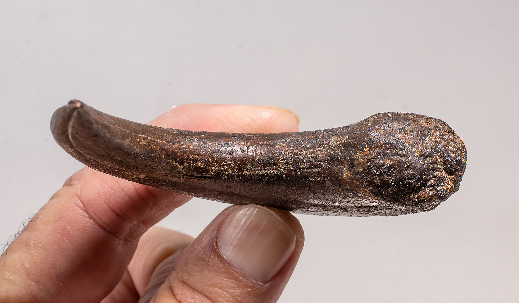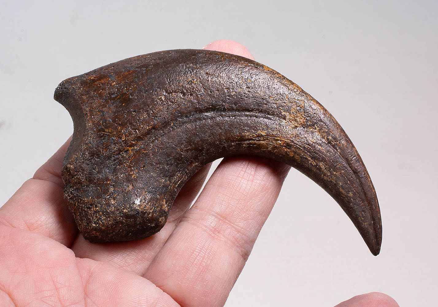 A striking fossil manual ungual (hand claw) belonging to a member of the Therizinosauridae, a group of unusual, long-clawed theropod dinosaurs from the Late Cretaceous. Unlike typical carnivorous theropods, therizinosaurs evolved enormous forelimbs and exaggerated claws adapted for specialized feeding behaviors.