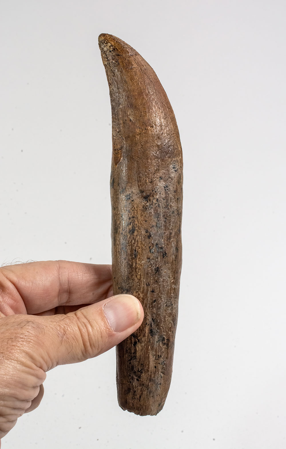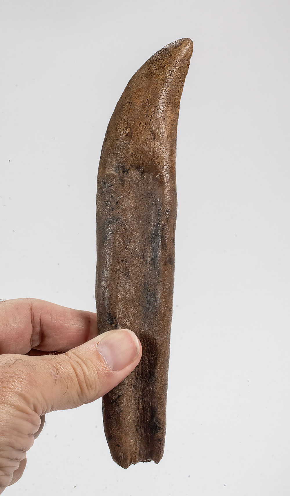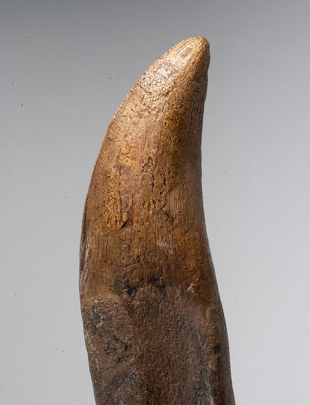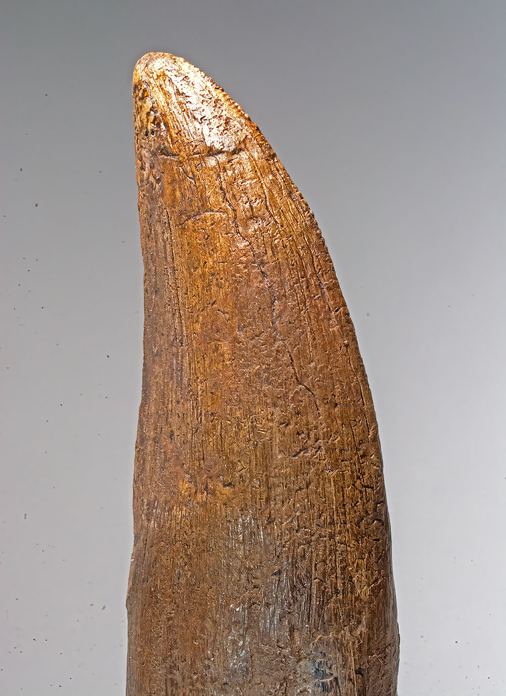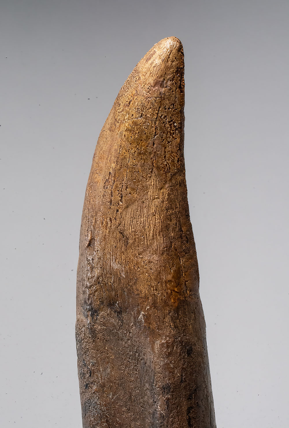A fossil tooth of Tyrannosaurus rex preserving both the crown and root, an especially desirable form of preservation for this iconic Late Cretaceous predator. Specimens retaining the root are less commonly recovered than isolated crowns, as post-mortem transport and geological processes often separate the tooth from its socket.