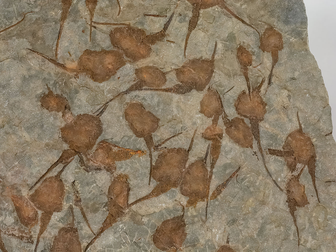 The slab is dominated by numerous stylophorans, an extinct and highly unusual group of echinoderms characterized by an asymmetric body and a single articulated appendage (“aulacophore”). Each individual is preserved in varying orientations, creating a dense, visually complex field of repeated morphologies across the rock surface. Their calcitic plates and appendages are often clearly outlined, allowing the overall body architecture to be appreciated in detail.