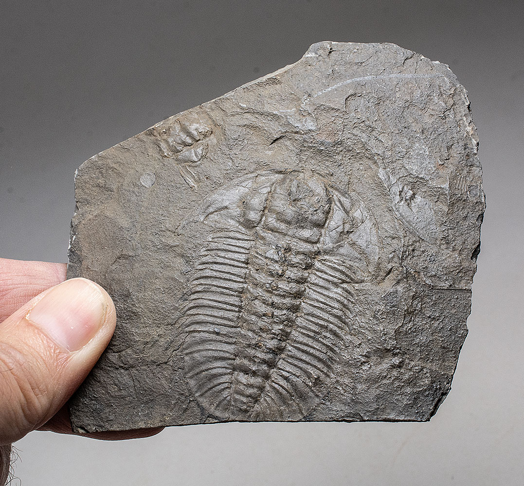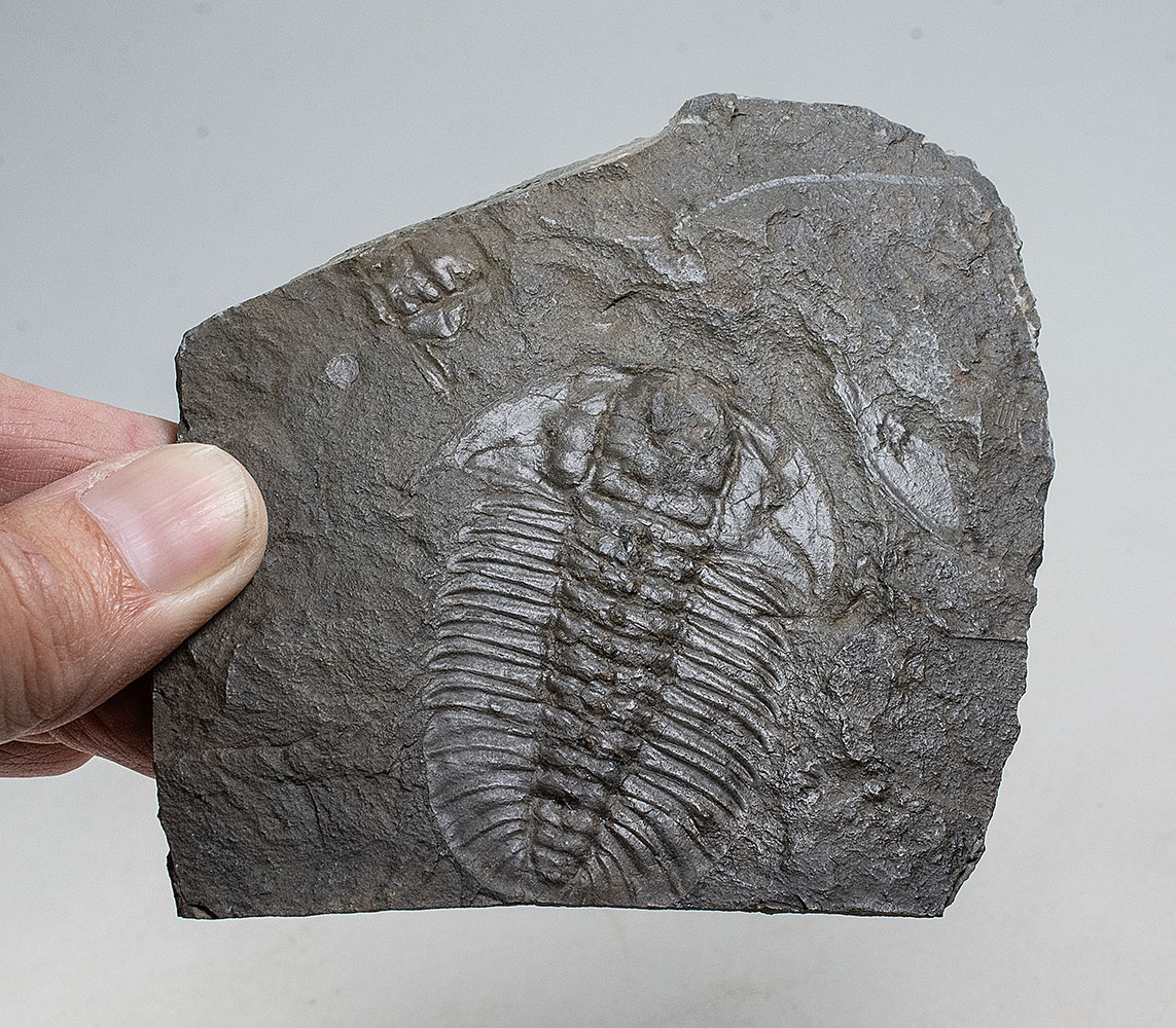 Big 65mm trilobite on 99mm slab. These are almost always missing the free cheeks so an example this complete is very rare. his specimen is unusual in that it has the silver sheen seen in other Burgess Shale specimens. We can’t see any soft parts, but it’ still a great specimen.