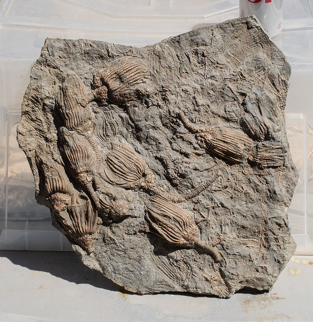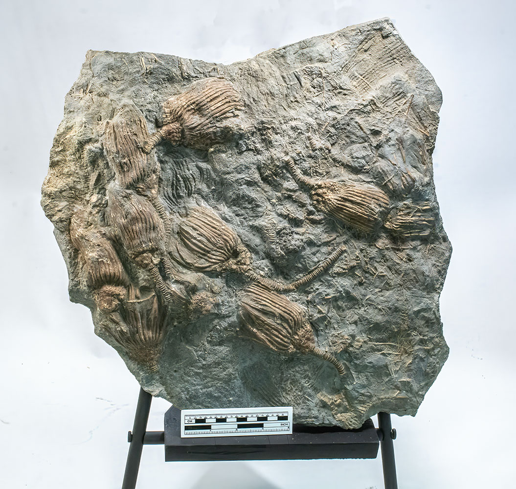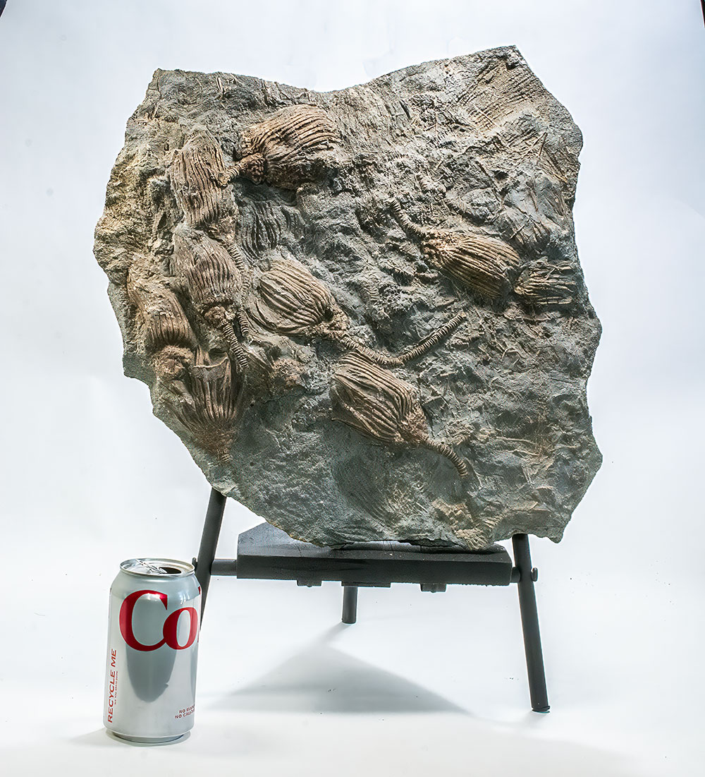 A large fossil limestone slab preserving an exceptional multi-specimen assemblage of Cactocrinus imperator, a striking Mississippian-age crinoid commonly referred to as a “sea lily.” This specimen contains at least 11 individual crowns, most of which remain attached to articulated stem segments, representing a highly desirable multi-organism preservation surface.