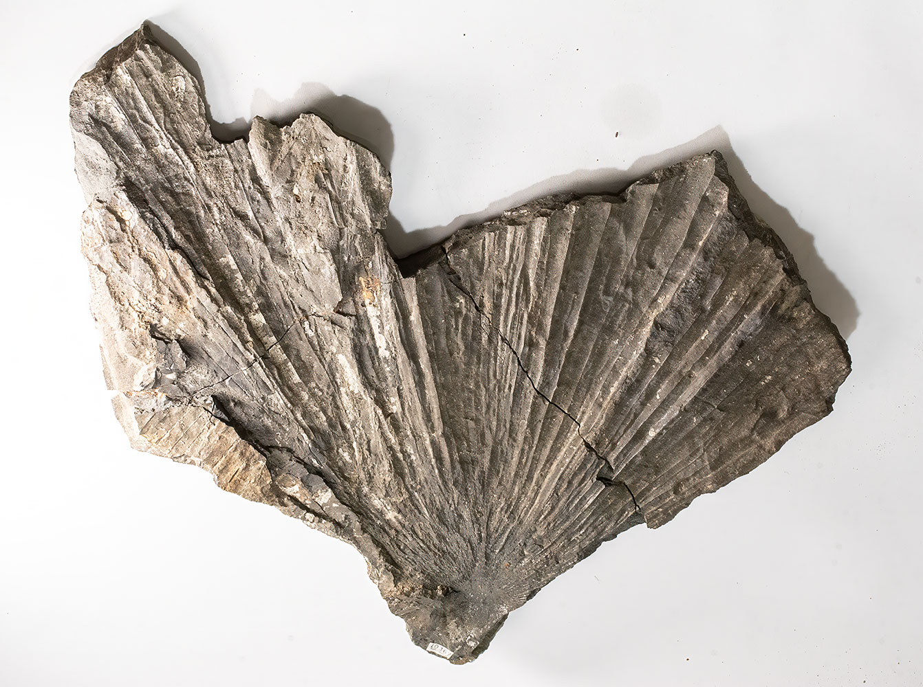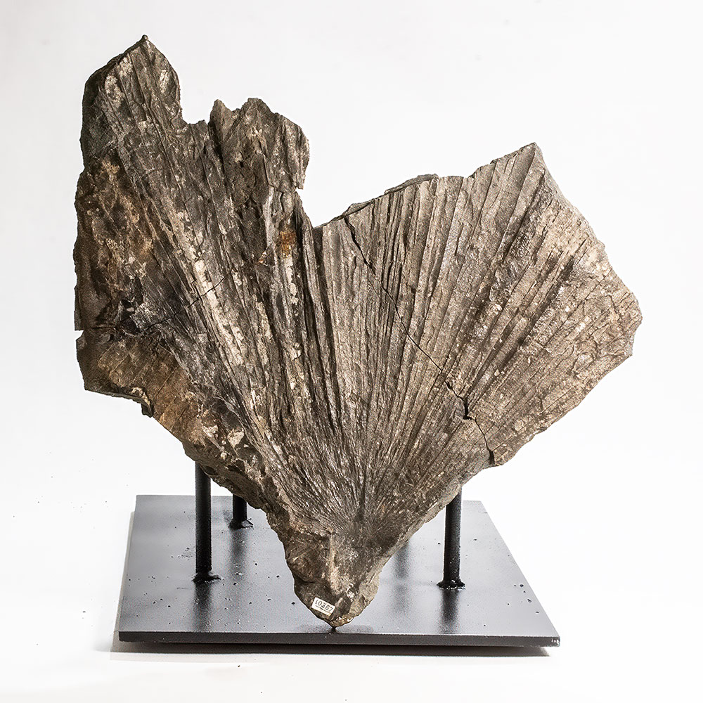 A fossil palm leaf of Sabalites campbelli, an extinct species representing early palm-like plants from ancient warm-climate environments. These fossils are well known for their distinctive fan-shaped morphology and are commonly associated with coastal or lowland tropical ecosystems.