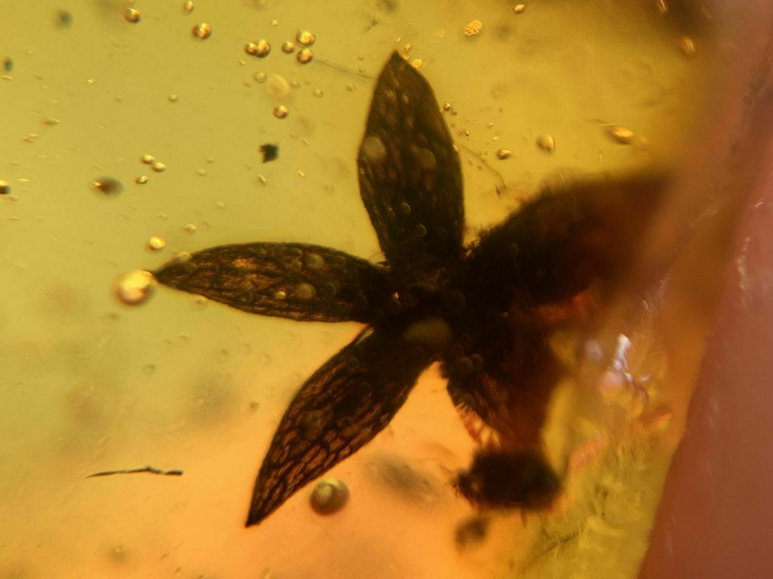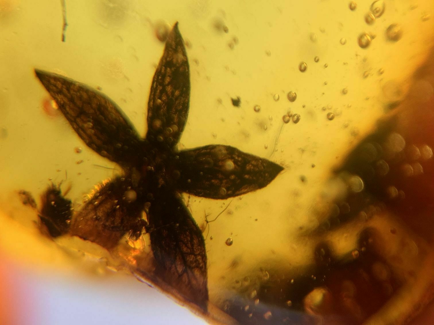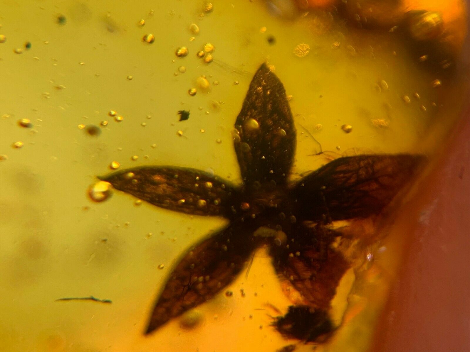 Vicinity of Maingkwan, north of Mogaunga, Myanmar (Burma) 5mm angiosperm flower in 17mm Burmite.amber.